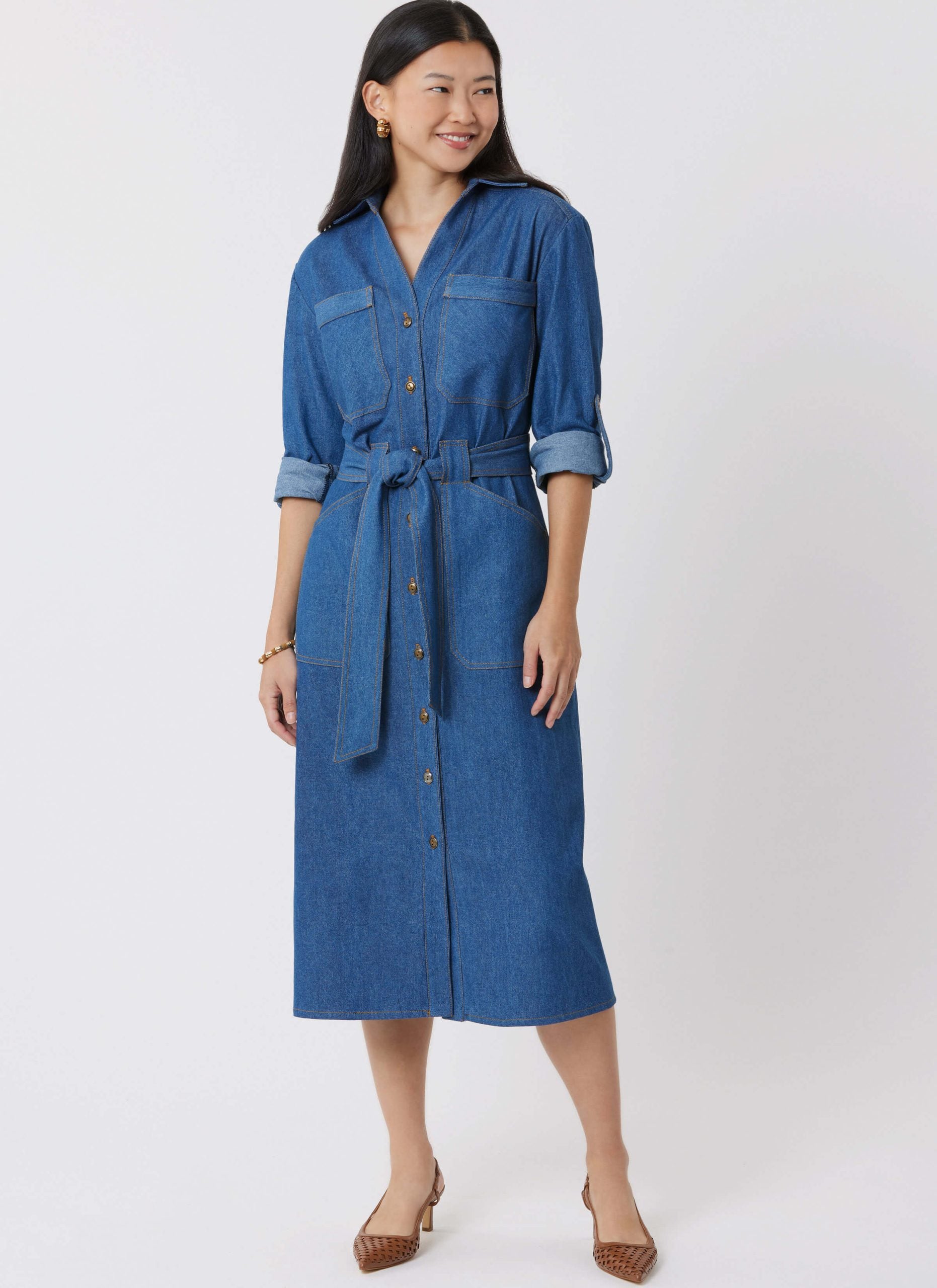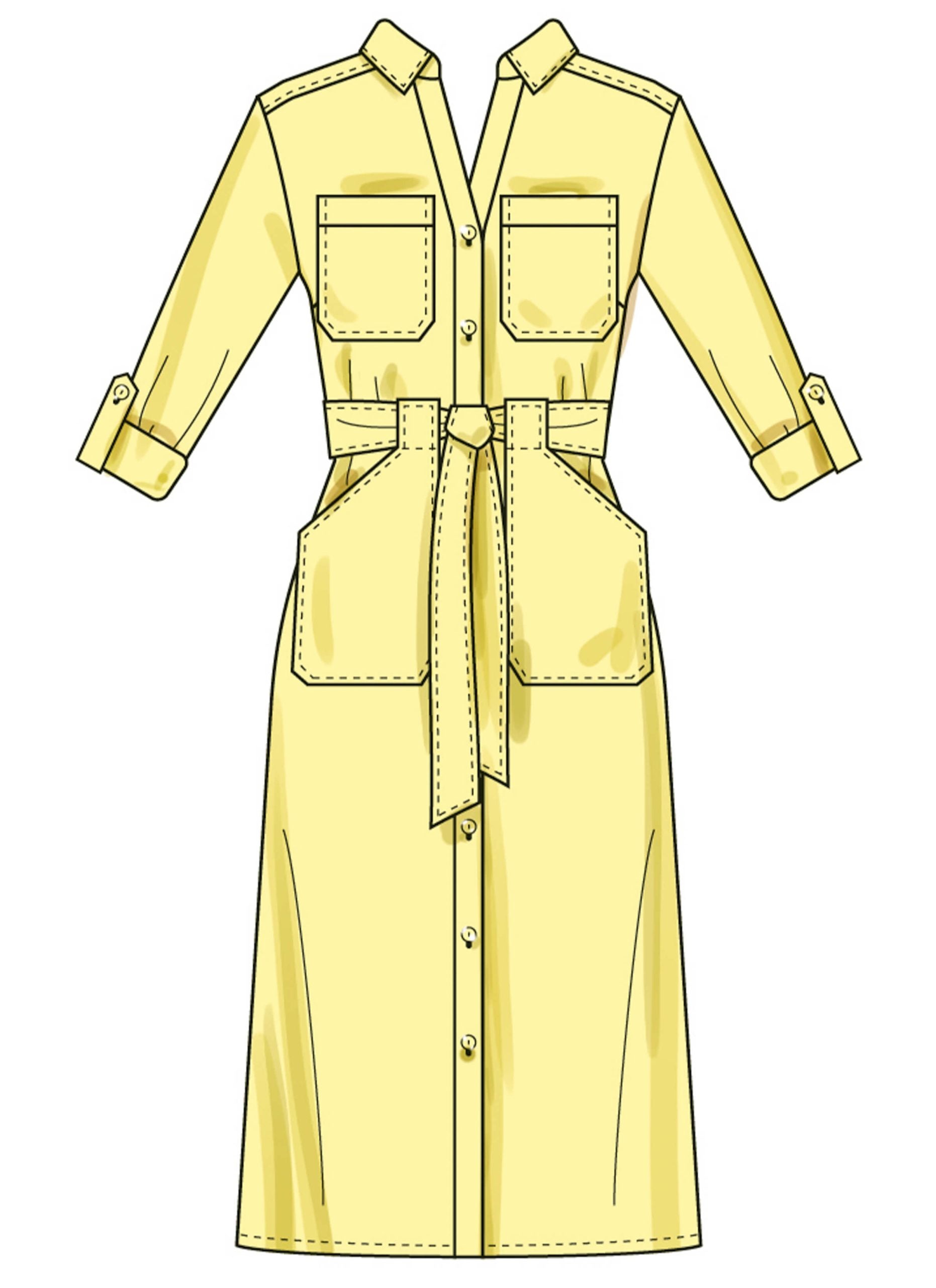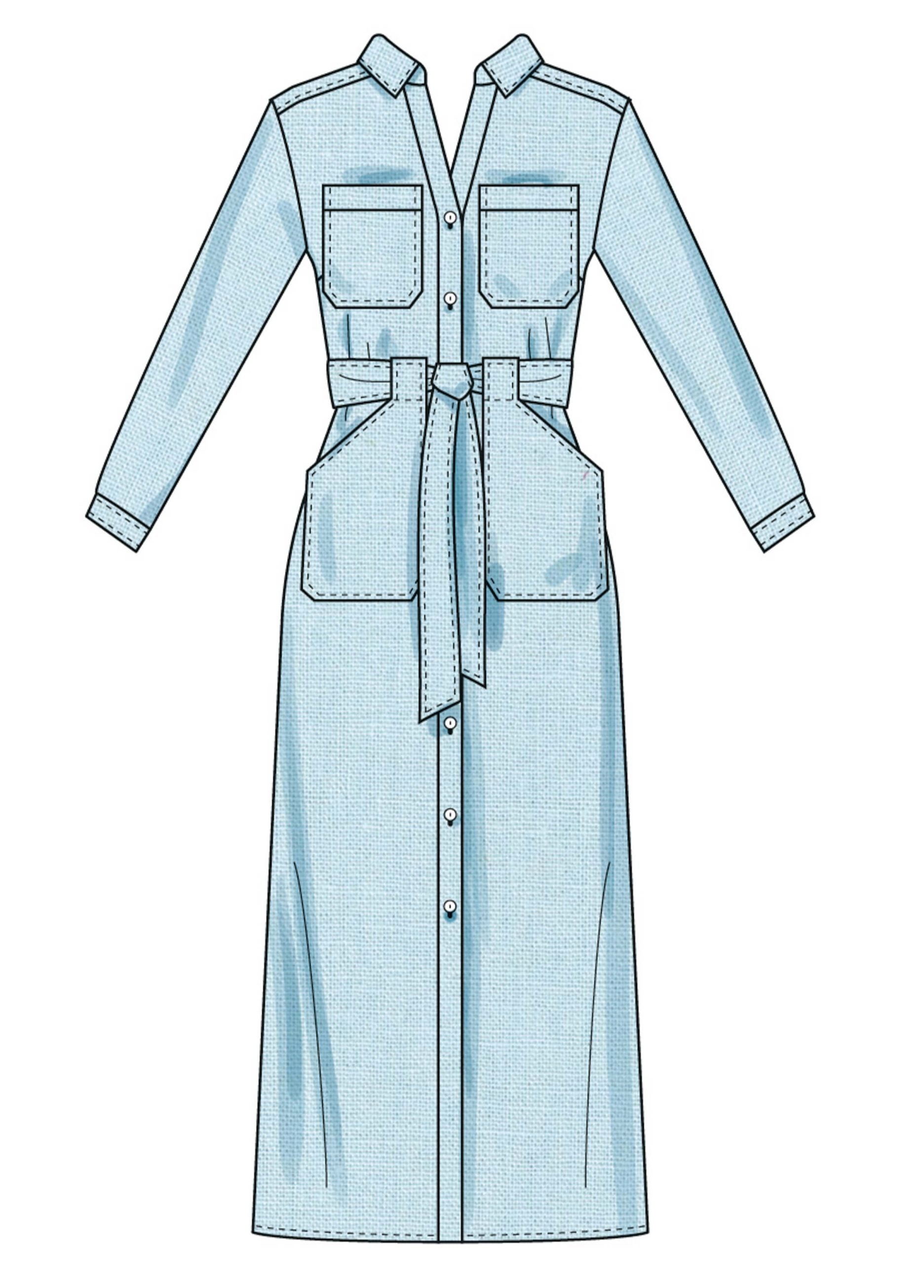 Kjoler i tre længder har knapåbning foran, krave, kraveophæng, sænkede skuldre, påsyede lommer foran, bærestykke bagpå, indsnit bagpå og ærmevarianter. Visning A har lange ærmer med manchetter. Visning B har rulleærmer med knapflig. Visning C har korte ærmer med en omfoldet manchet.