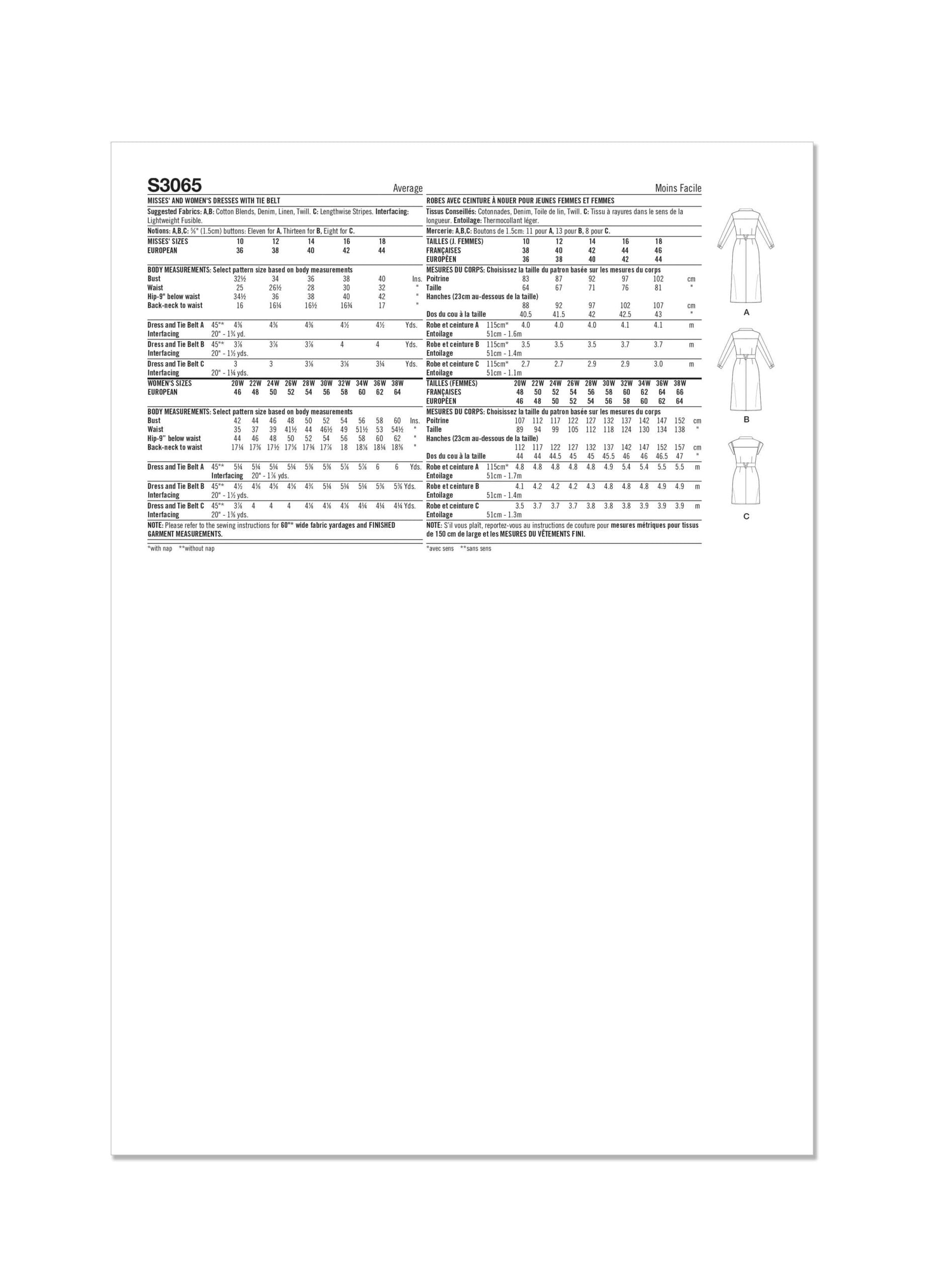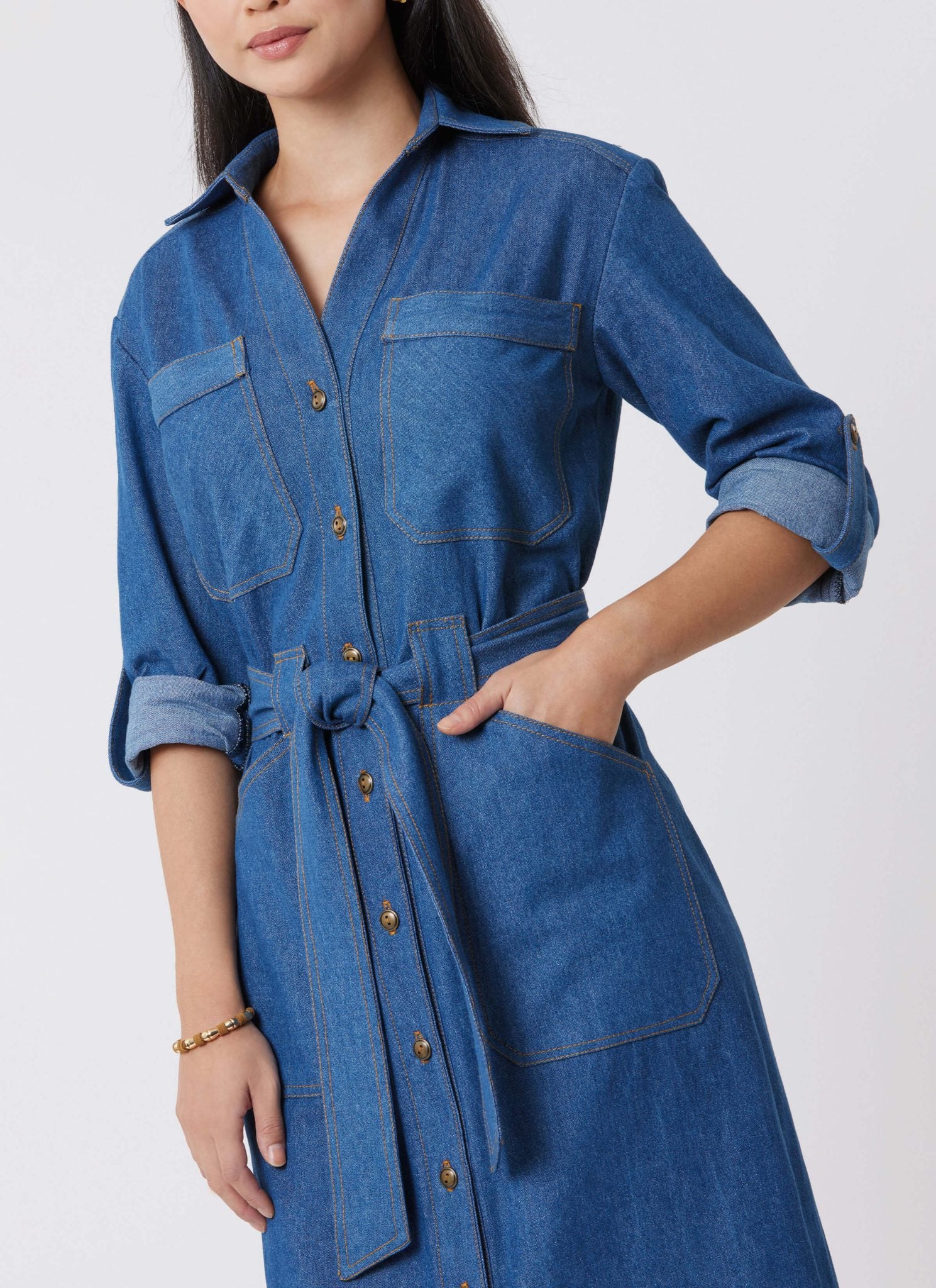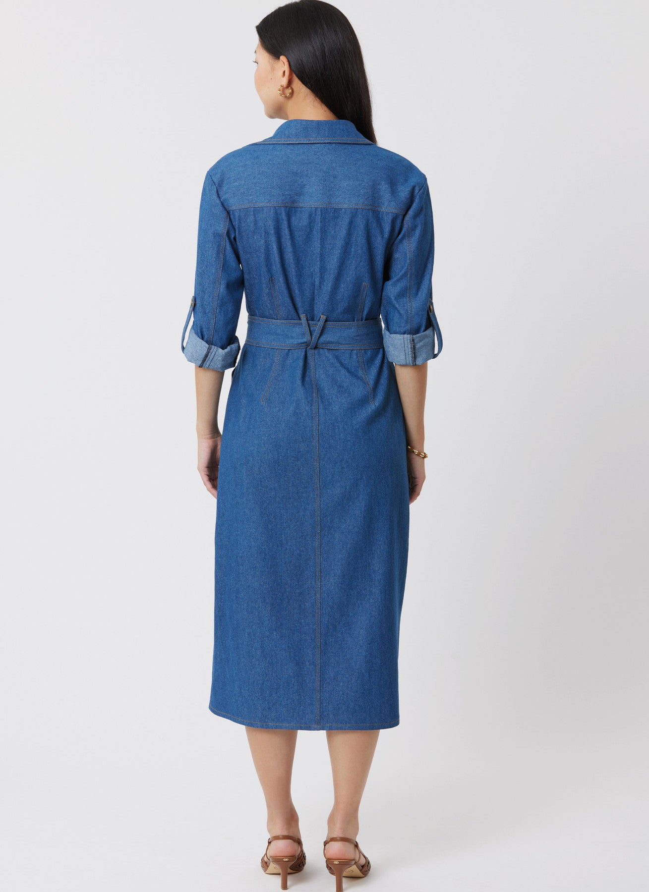Kjoler i tre længder har knapåbning foran, krave, kraveophæng, sænkede skuldre, påsyede lommer foran, bærestykke bagpå, indsnit bagpå og ærmevarianter. Visning A har lange ærmer med manchetter. Visning B har rulleærmer med knapflig. Visning C har korte ærmer med en omfoldet manchet.