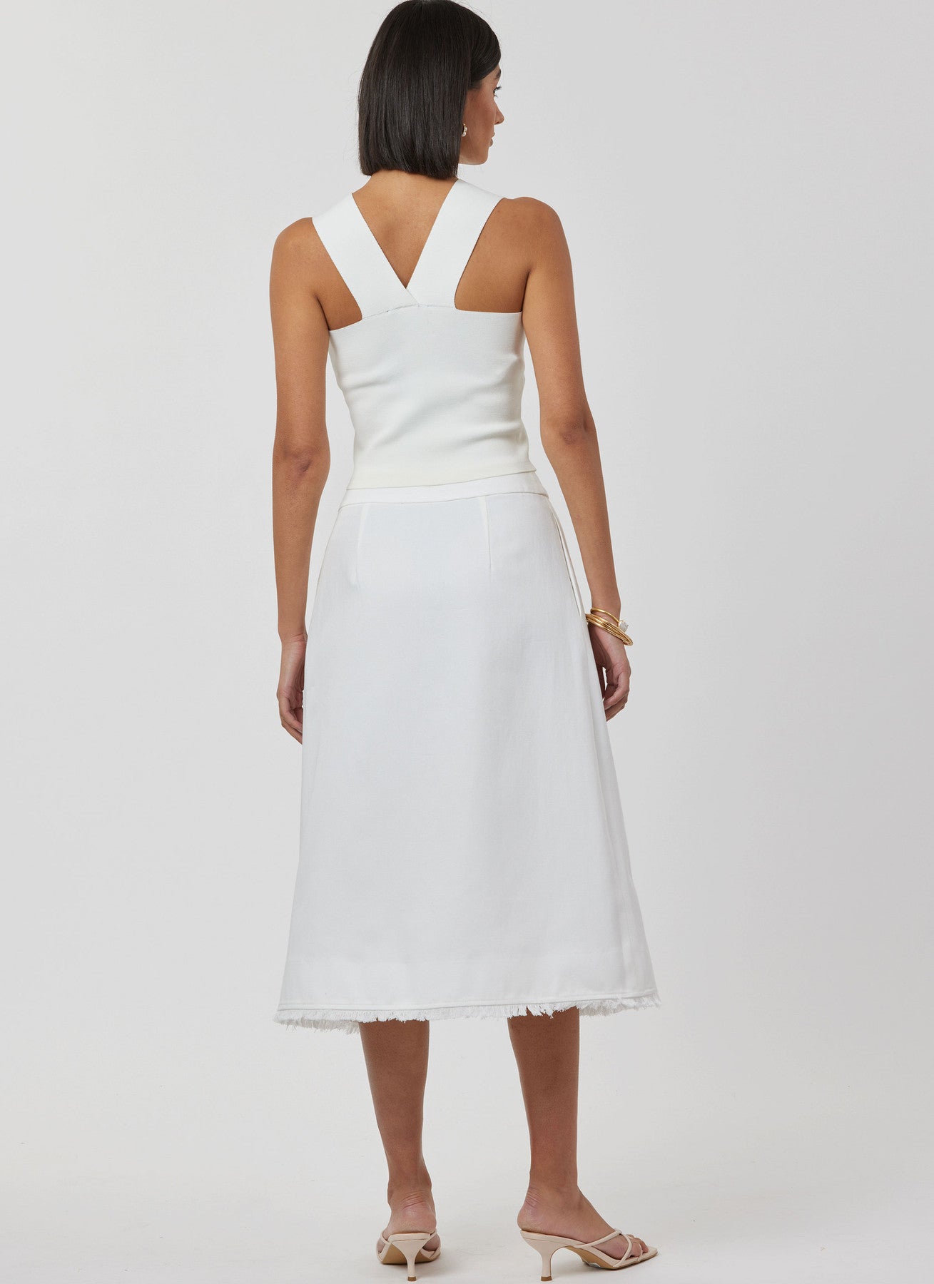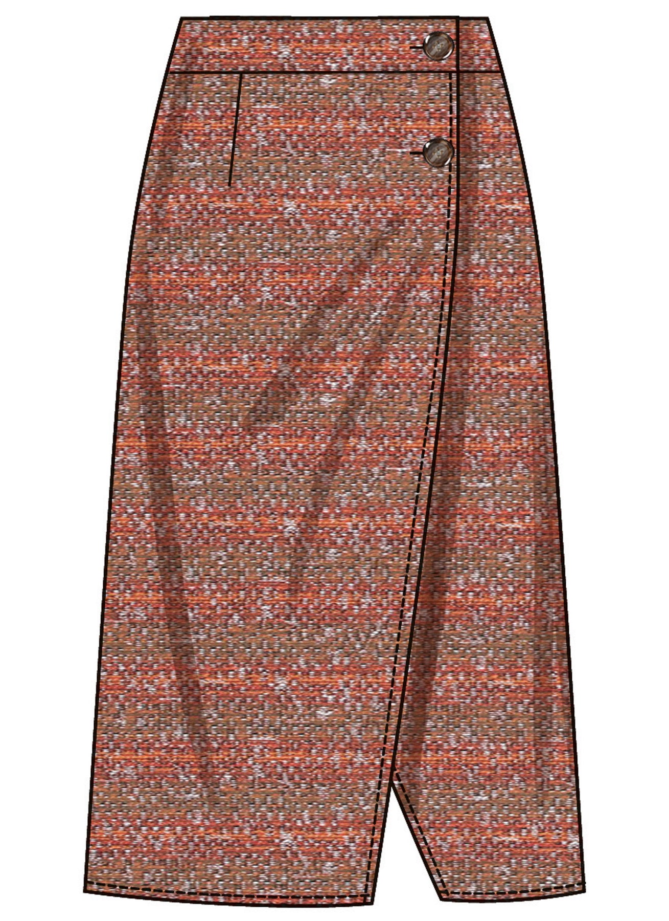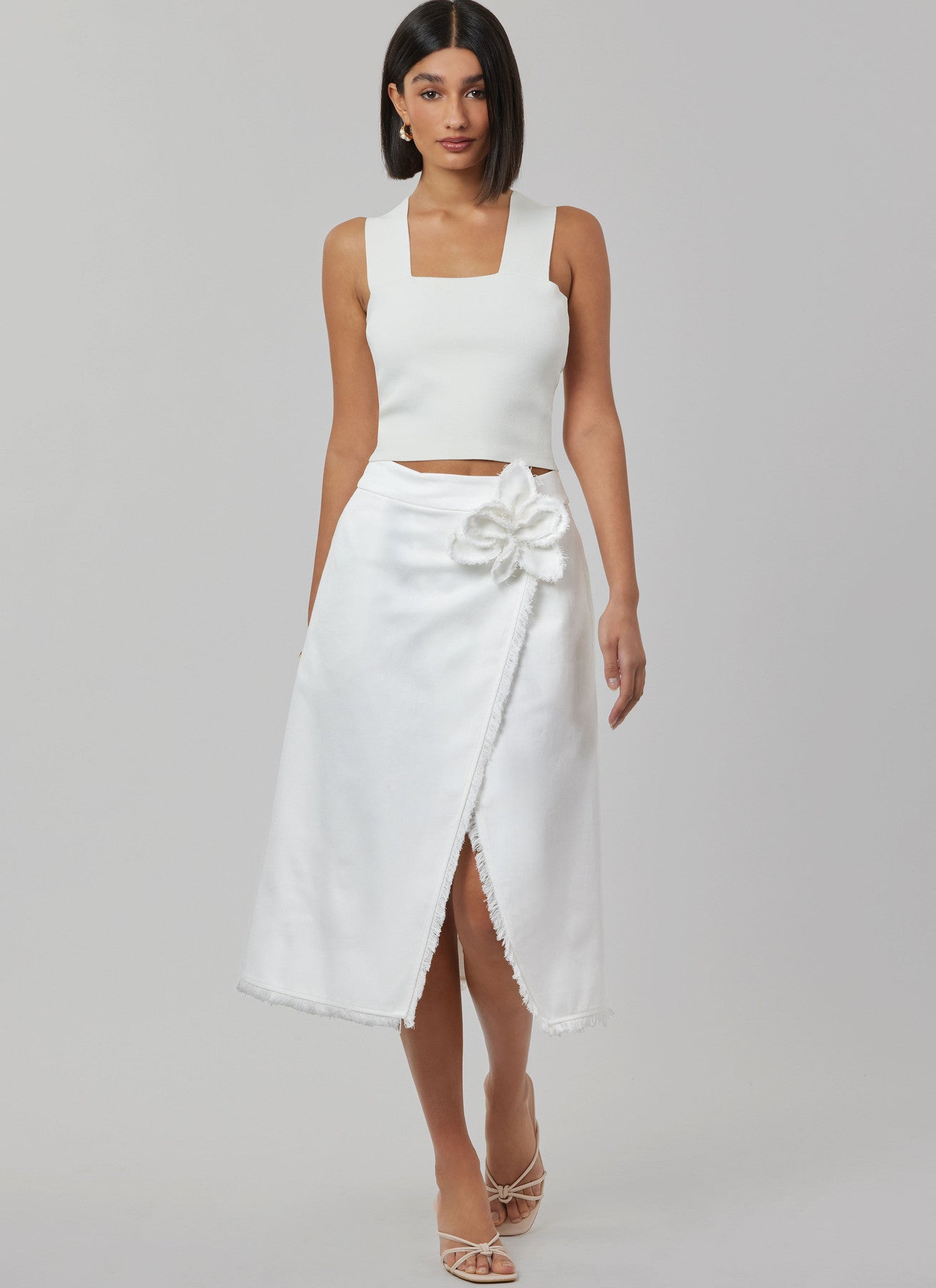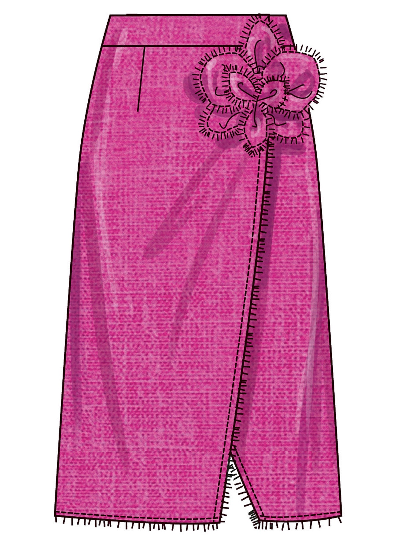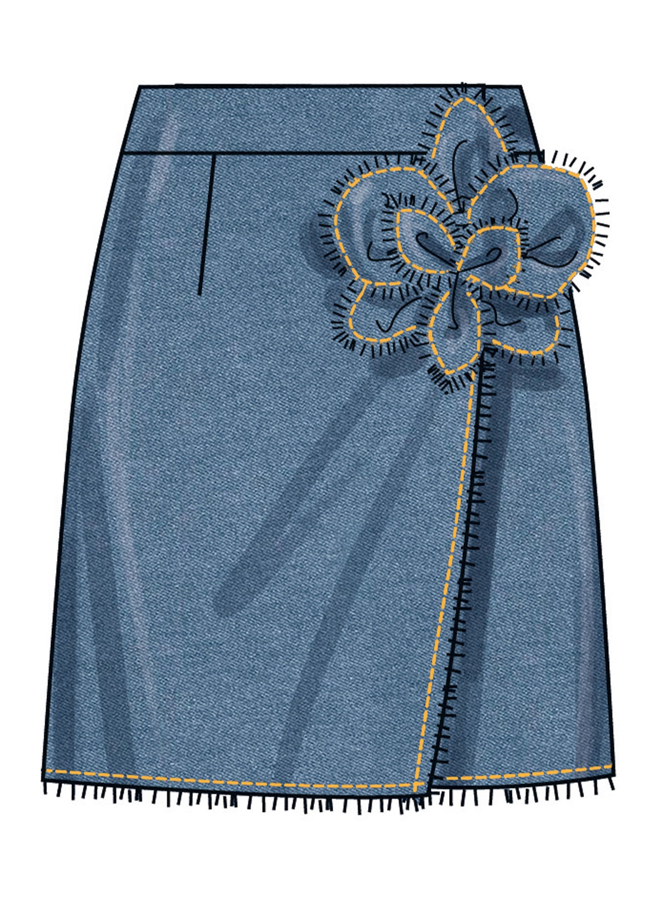 Slå-om-nederdel i to længder med aftagelig 3D-blomst og flossede kanter. Slå-om-nederdele, der sidder til gennem hoften, har kontureret linning, knaplukning og sidesømlommer. Kan bæres med eller uden 3D-stofblomst. Billede A og B har frynser