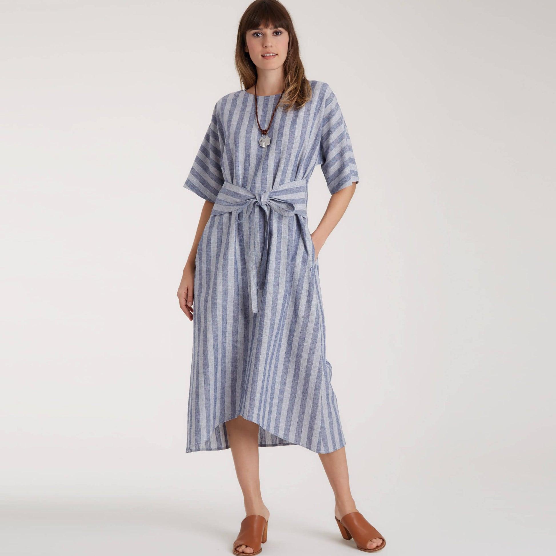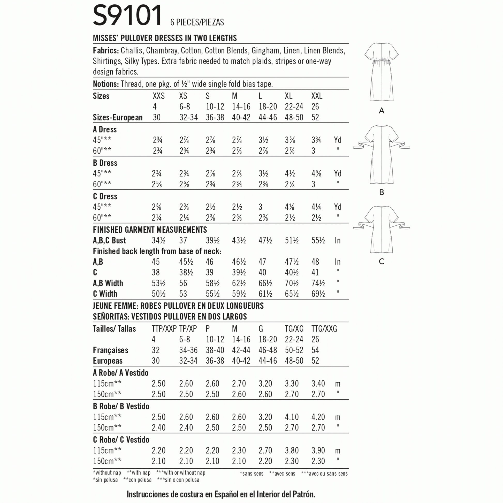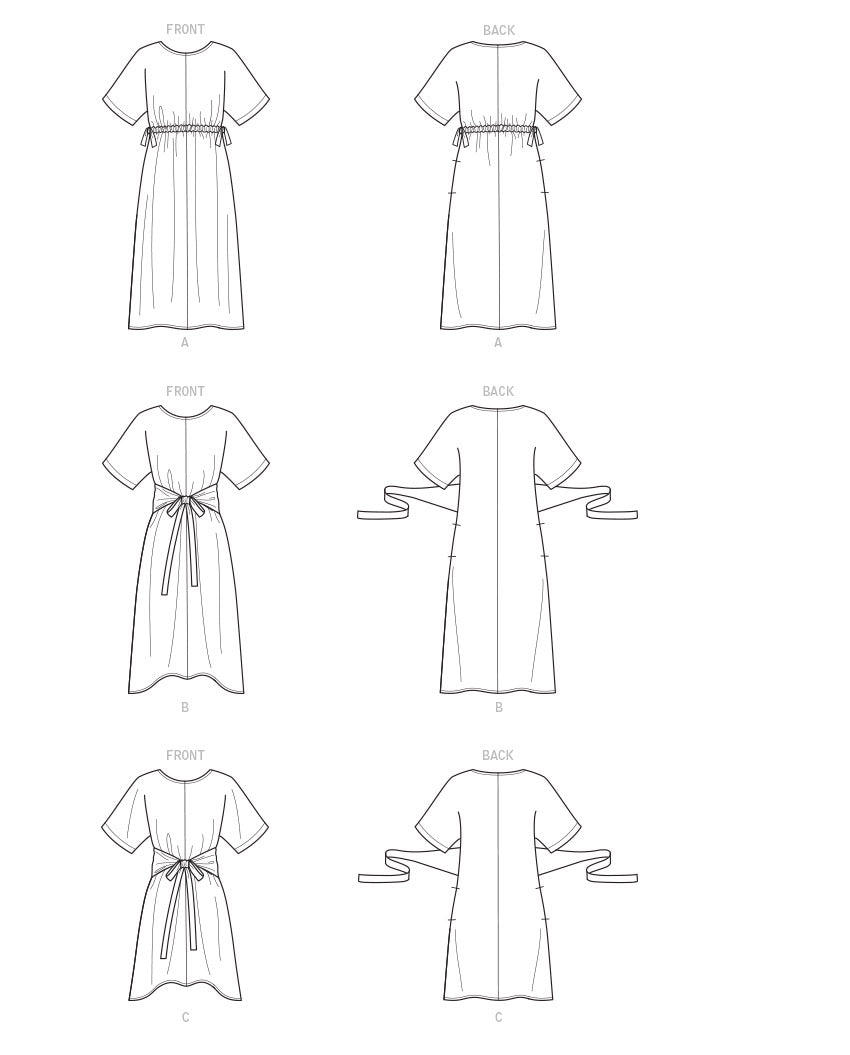 Kjoler til kvinder i to længder. A: snøre i taljen. B: C: bindebælte foran.